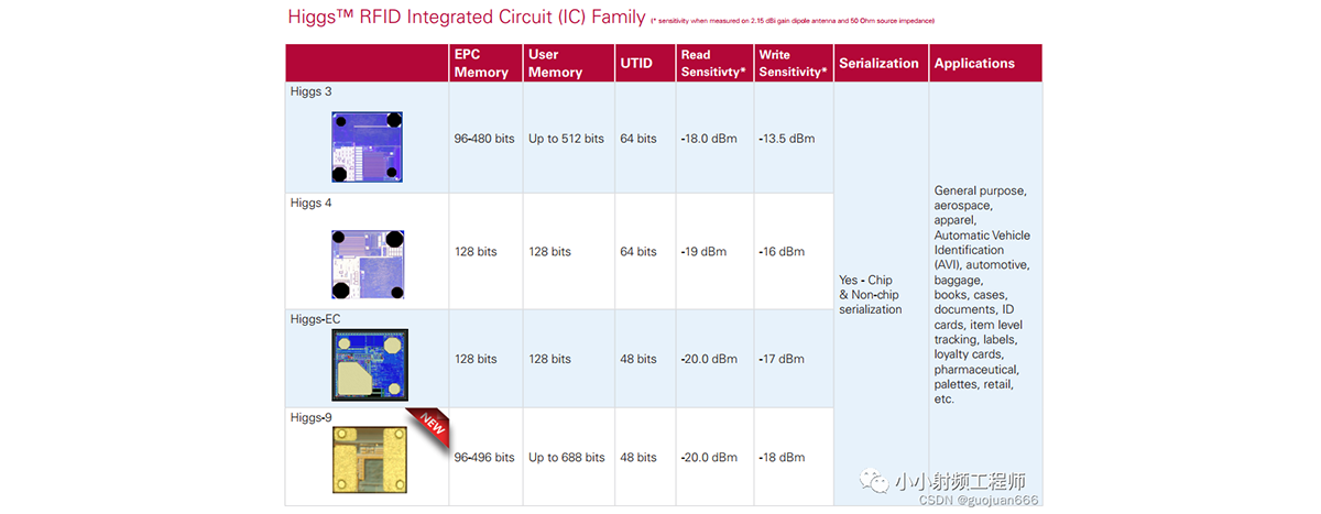 但隨著各種新應(yīng)用的出現(xiàn),新的領(lǐng)域?qū)?biāo)簽讀距要求越來越高等原因,漸漸地,H3的讀取靈敏度難以達(dá)到需求。Alien也更新升級(jí)了他們的芯片,就有了后來的H4(Higgs 4)、H5(HiggS EC)、H9(Higgs 9)。一(不要問我H6、H7、H8去哪子,我也不知道。)