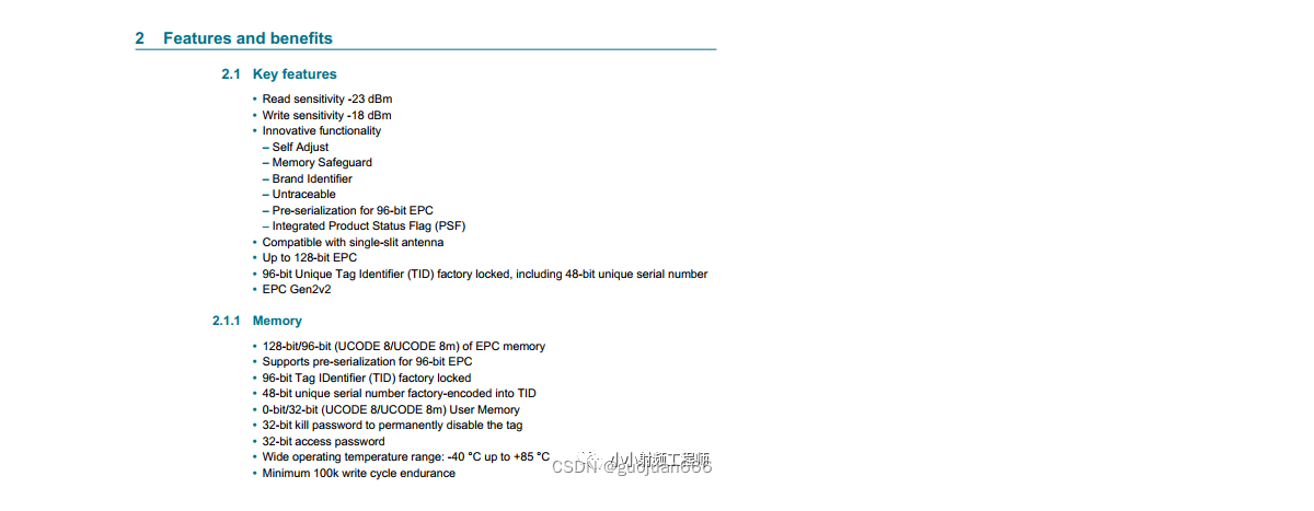 大部分的信息直接在第二部分的features and benefts這塊展示出來了。包括:芯片讀寫靈敏度,芯片存儲(chǔ)區(qū)分區(qū)及各區(qū)大小,芯片協(xié)議,特色功能等。